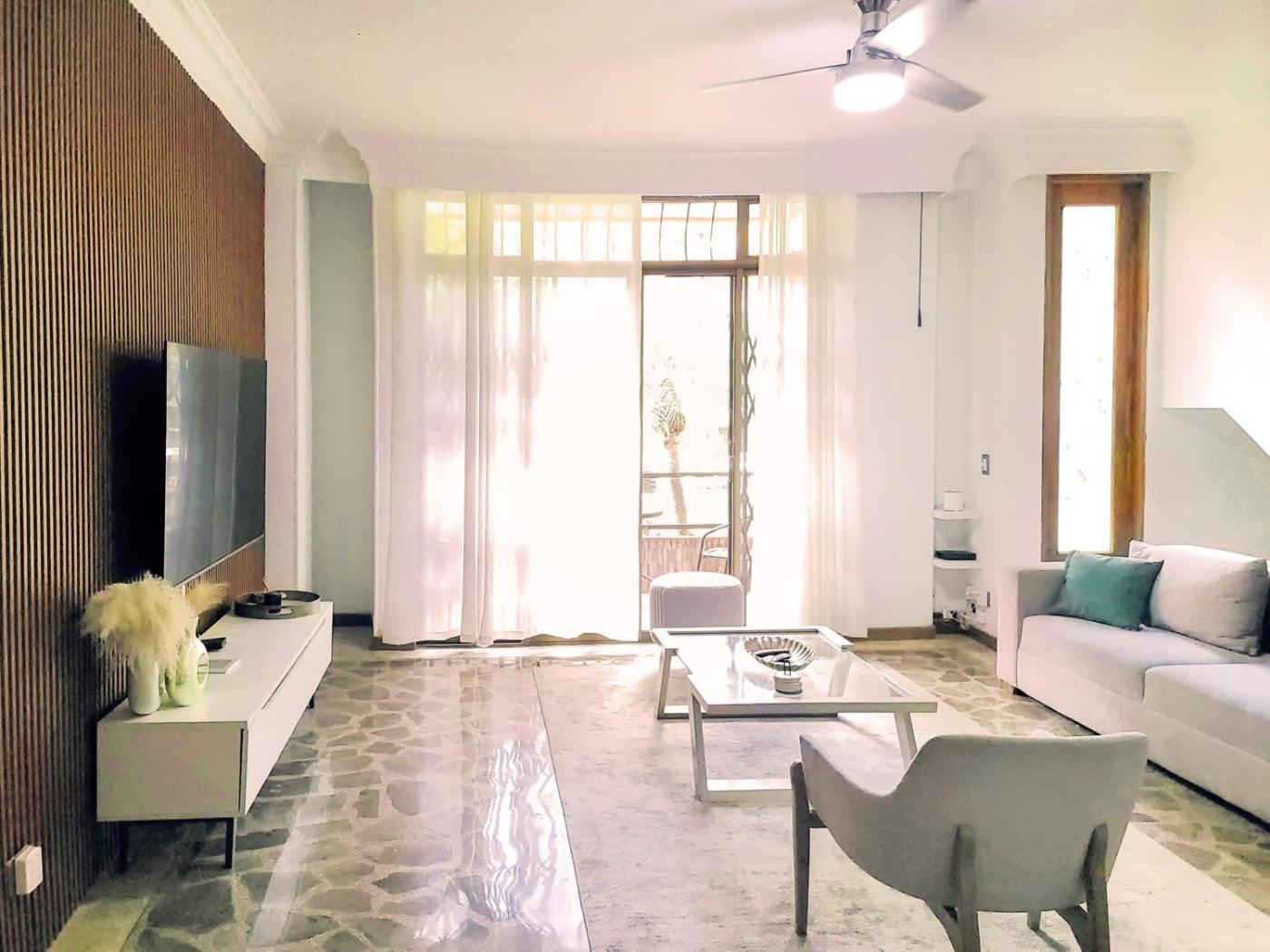 Three-Bedroom Apartment. This spacious apartment consists of 3 bedrooms, a seating area with a sofa and 3 bathrooms with a shower. Meals can be prepared in the well-fitted kitchen, which is equipped with a stovetop, a refrigerator, kitchenware and an oven. Featuring a balcony with garden views, this apartment also provides a washing machine and a flat-screen TV. The unit offers 3 beds.